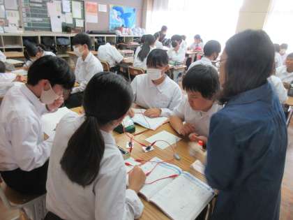 10月20日(金)今日の授業の様子 その7 公開日 2023/10/20 更新日 2023/10/20 お知らせ 2年生の理科の授業です。 直流回路と交流回路について実験に取り組んでいました。大きさにどんな違いが出るのか、電流計を活用しながら、進んで実験に取り組んだり、グループで考察を考えたりする生徒たちの姿が見られました。頑張っていました!