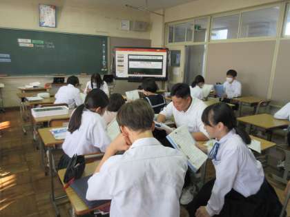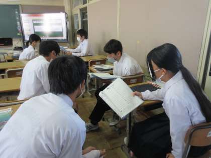 10月24日(火)今日の授業の様子 その1 公開日 2023/10/24 更新日 2023/10/24 お知らせ 2年生の英語科の授業です。 授業の初めに「動名詞を使ってすらすら英会話」にチャレンジする2年生。近くの友達とプリントを見ながら、笑顔で英会話に取り組む姿が見られました。進んで英会話にチャレンジする2年生、頑張っていますね!