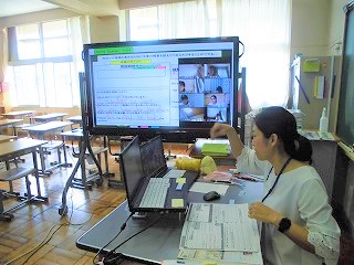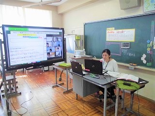 3年生の英語の授業です。先生の質問に対して,マイクのONとOFFを上手に使って回答しています。頑張ってます!