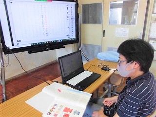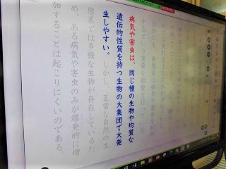 3年生の国語の授業です。今日は「絶滅の意味」という説明文を読んでいます。画面共有で動画で読んでいるところが示されています。