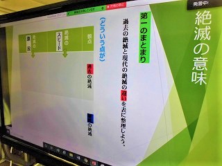 オンライン授業2 公開日 2021/09/14 更新日 2021/09/14 お知らせ 3年生の国語です。説明文「絶滅の意味」の読み取りです。今日は,過去と現代の絶滅の意味について調べています。画面共有で読み取る内容を示し,仲間達が考え泰用にしています。