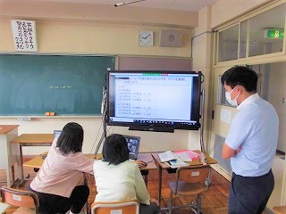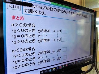 3年生の数学の授業です。関数についての学びです。オンライン授業にて授業しやすいような小道具も先生方の創意工夫で創り出しています。