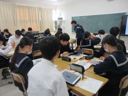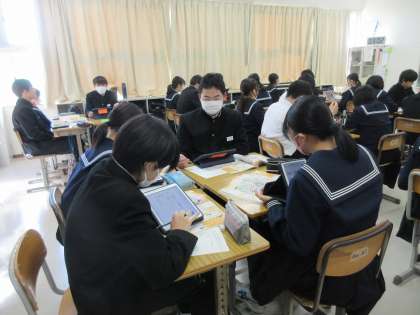 11月13日(月)今日の授業風景 その1 公開日 2023/11/13 更新日 2023/11/13 お知らせ 3年生の社会科の授業です。 単元「私たちの消費生活」の学習を進めています。今日のテーマは「コンビニエンスストアの経営者になってみよう」です。資料をもとに、どの場所でコンビニを経営するか、根拠を大切にしながら考える生徒たち。熱心に話し合いに取り組む3年生です!