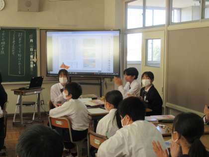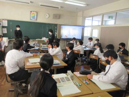11月16日(木)今日の授業風景 その2 公開日 2023/11/16 更新日 2023/11/16 お知らせ 1年生の国語科の授業です。 竹取物語の学習も進み、今日のテーマは「結末で、かぐや姫はどのようなことを考えたのか」です。かぐや姫が「〇○に」宛てた手紙を考えた生徒たち。自分の考えを堂々と表現する姿が印象的でした。聞く姿勢もよい1年生。たくさんの拍手が聞こえていました。