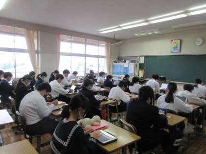 一次関数に関する問題にチャレンジしていました。タブレット上に示された問題を根気強く解く1年生。グラフを拡大ししたり、考えを書き込んだりしながら問題解決を目指します。1年生の生徒たちも落ち着いた雰囲気の中で、今日も頑張っています!