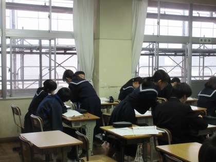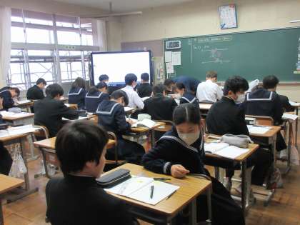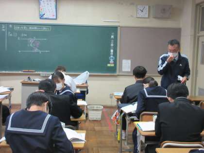 11月17日(金)今日の授業風景 その8 公開日 2023/11/17 更新日 2023/11/17 お知らせ 2年生の数学科の授業です。 「図形の性質を補助線を引いて調べよう」というテーマのもと、問題解決を目指し、粘り強く取り組む2年生の生徒たちです。角度を求めるために、補助線を大事にして考える生徒たち。友達と考えを交流させながら、解決を目指していました!