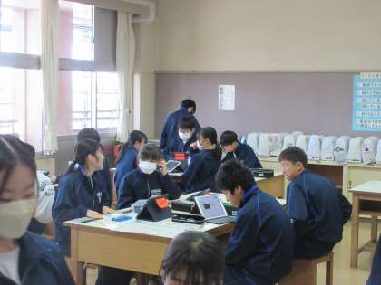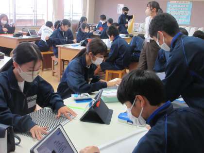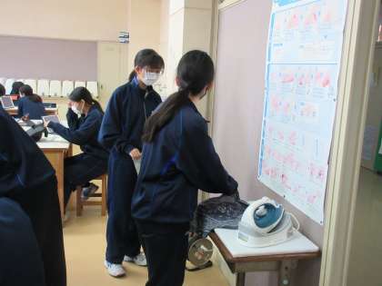 11月20日(月)今日の授業風景 その6 公開日 2023/11/20 更新日 2023/11/20 お知らせ 2年生の家庭科の授業です。 「手縫いをしよう」をテーマに被服室で学習に取り組む2年生。電子黒板に示された手順に沿って、作業をすすめています。布をていねいにおり、アイロンを使って作業を進める生徒たち。久しぶりの縫い物ですが、頑張って作業を進める姿が印象的でした。