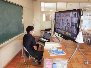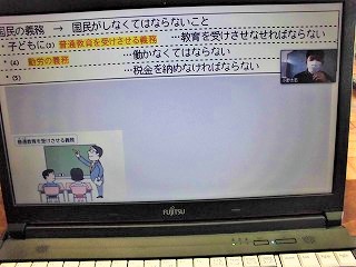 3年生の社会の授業です。公民分野です。今日は,公共の福祉について授業者の熱い語りを聞きながら仲間達は考えています。担任も授業に参加し,授業を受ける側の視点でオンライン授業の進め方を研修しています。