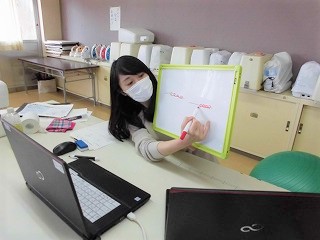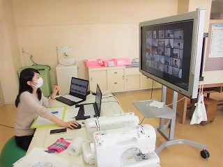 3年生の家庭科の授業です。裁縫の確認をしています。授業者は,仲間達にわかりやすく伝えるために,パワーポイントの資料や写真,動画,ホワイトボード等を駆使して授業を進めています。