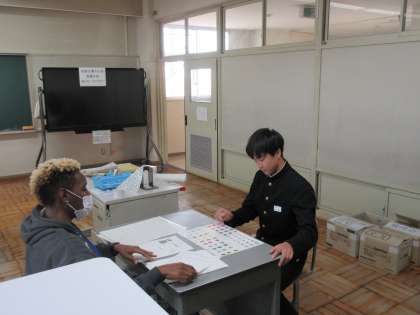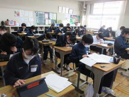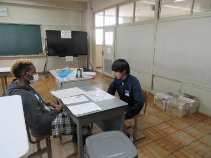 11月27日(月)今日の授業の風景 その5 公開日 2023/11/27 更新日 2023/11/27 お知らせ 2年生の英語科の授業です。 「レッツ!ショッピング!」をテーマにしたパフォーマンステストにチャレンジする2年生の生徒たちです。ALTと英会話にチャレンジする姿を見て、とても頼もしく感じました。自信をもって英会話にチャレンジする生徒たちです!