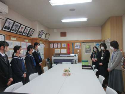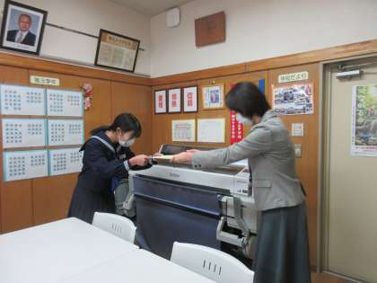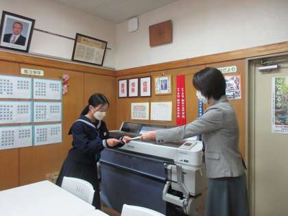 本日の放課後、中学校POPコンテスト贈呈式を校長室にて実施しました。市中央図書館の先生方が来校され、本校生徒たちを表彰していただきました。