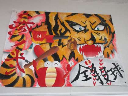 3年2組の学級旗で目を引くのが、なんと言っても迫力満点な「虎」です。赤を基調に情熱やパワフルさを表現しています。全力投球でこれまで力を合わせ、行事を乗り越えてきた3年2組。今は、一人一人の目標に向かって、落ち着いた雰囲気の中で全力投球しています!(学級旗の中のカニもチャーミングポイントです!とても可愛いです。)