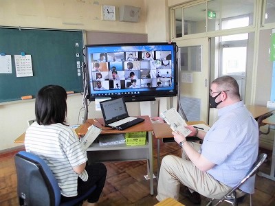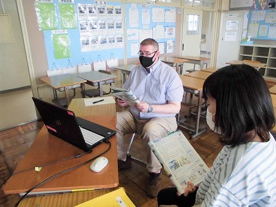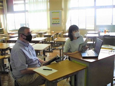 1年生の英語の授業です。授業者とALTがコンビネーションよく授業を創りあげています。ATLの発音の後,家ではしっかりと発声していることと思われます。頑張れ!