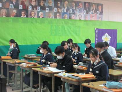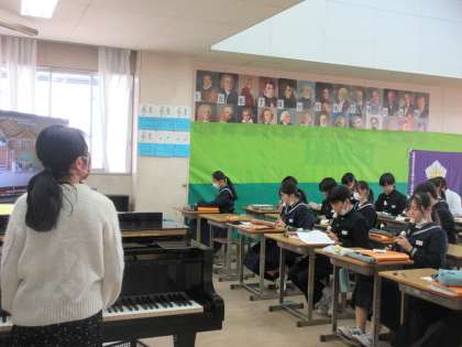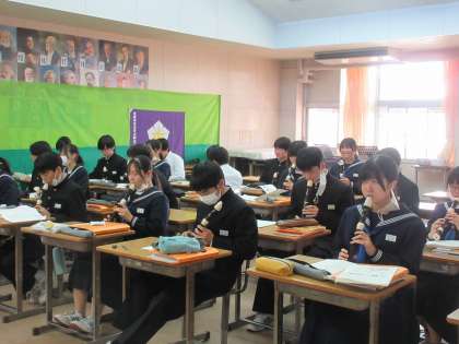12月6日(水)今日の授業の風景 その9 公開日 2023/12/06 更新日 2023/12/06 お知らせ 3年生の音楽科の授業です。 ちょうど、音楽室を訪ねたときは、「アルトリコーダー」の練習に取り組んでいました。楽譜を見ながら、アルトリコーダーをふく生徒たち。担当の先生が刻むリズムに合わせて、熱心に演奏が行われていました。やわらかな音色が音楽室に広がっていました!