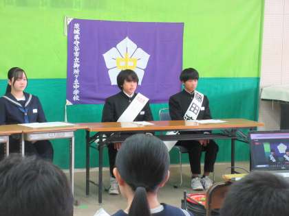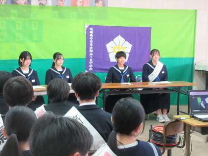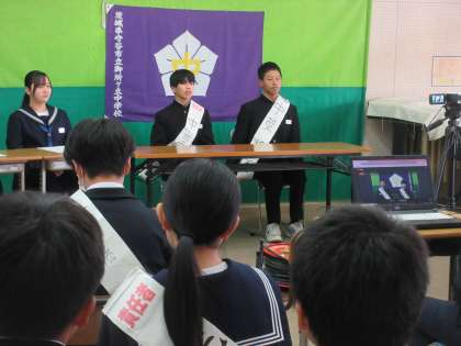 12月6日(水)生徒会演説会 その3 公開日 2023/12/06 更新日 2023/12/06 お知らせ 各候補者のポスターには、御所ケ丘中学校を「日本一の学校にする」「笑顔あふれる・笑顔が絶えない・笑顔の輪が広がる学校」「あいさつを大切にする学校」など、本校の誇りと伝統を受け継ぐメッセージが記載されています。また、そのために「一人一人を尊重する」「多種多様を尊重する」「引っ張っていく」などの思いも書かれていました。 頼もしい生徒たちです!