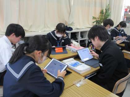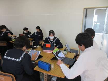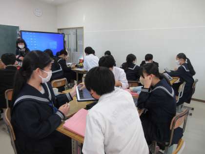 12月7日(木)今日の授業の風景 その5 公開日 2023/12/07 更新日 2023/12/07 お知らせ 3年生の国語科の授業です。 「歌詞にはどんな思いや技法がつまっているか」について学習を進めています。つめこまれている思いや技法を探る生徒たち!好きな曲の歌詞を見ながら、曲を聴きながら、探究する姿が見られました。楽しみながらの学習に生徒たちの表情も素敵でした!