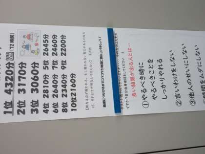 2年生のある教室のロッカーには、先日、実施した後期中間テストに向けた「家庭での学習時間」ランキングが掲示されていました。毎日のこつこつとした積み重ねで、一人一人が達成できたのでしょう!素晴らしい!そして、励みになります!