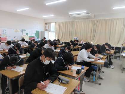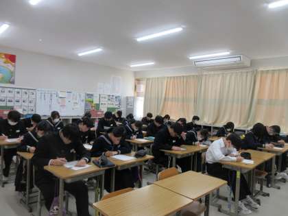 12月8日(金)朝の様子 その3 公開日 2023/12/08 更新日 2023/12/08 お知らせ 3年生の朝の時間の様子です。来週、3年生は学年末テストを控えています。今朝は、各クラスで社会科のテストに取り組んでいました。どのクラスの生徒も集中力がすごい!!朝からしっかり活動に取り組む3年生です!