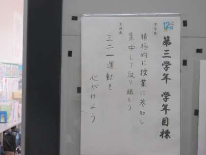 12月8日(金)3年生の廊下には・・・ 公開日 2023/12/08 更新日 2023/12/08 お知らせ 3年生の廊下には、学年目標が掲示されていました。生活面での目標は「三二一運動」!3分前入室、2分前着席、1分前は静かにする という取組を通して、切り替えをしっかり行う3年生です。さすがです!