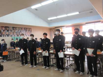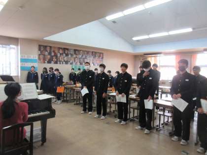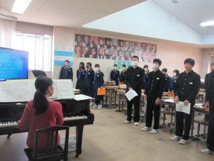 12月8日(金)今日の授業の風景 その1 公開日 2023/12/08 更新日 2023/12/08 お知らせ 3年生の音楽科の授業です。 授業の最初に「校歌」を歌う3年生。音楽室の前に集まり、しっかり歌う姿が見られました。ちょっと早いですが、一生懸命歌う3年生の姿に「卒業式」という言葉も頭に浮かんできてしまいました!