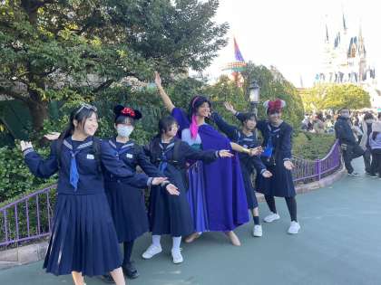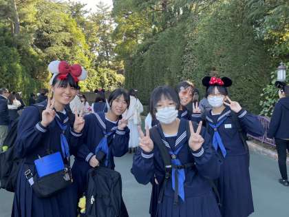 生徒たちのパーク内での活動の様子です。みんな楽しそう!!シンデレラ城が近くに見えますね。ポーズも決まっています!!