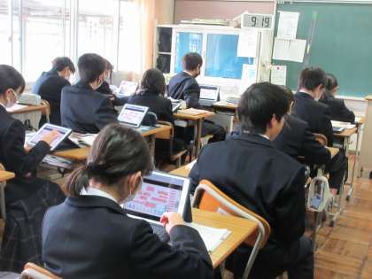 12月11日(月)今日の授業の風景 その6 公開日 2023/12/11 更新日 2023/12/11 お知らせ 1年生の国語科の授業です。 「単語の分類」について学習を進めています。学習のまとめにデジタル教科書のQRコードを読み取り、タブレット上で「単語の分類の問題」にチャレンジする生徒たち。文節をもとに主語や述語、修飾語・・・など単語のイメージを広げる生徒たち。頑張っていました!