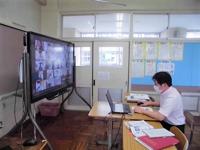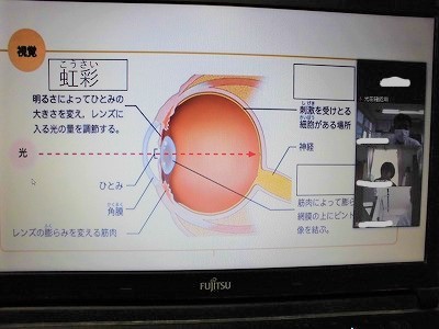2年生の理科の授業です。生物分野,人体の感覚器官の学びです。画面共有を効果的に活用して授業が進みます。頑張れ!