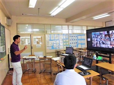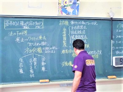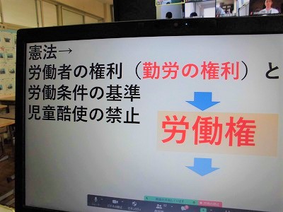 3年生の社会の授業です。今日は,基本的人権についての学びです。対面授業と変わらない授業が進みます。仲間達の画面越しの授業者の話をよく聴いて学んでいます。頑張ってます!