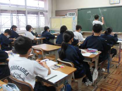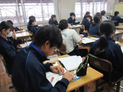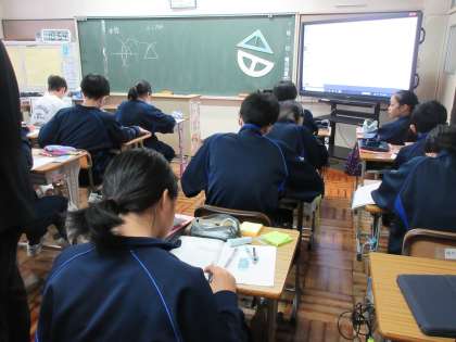 12月12日(火)今日の授業の風景 その1 公開日 2023/12/12 更新日 2023/12/12 お知らせ 1年生の数学科の授業です。 「いろいろな作図」をテーマに学習を進めています。垂線の作図にチャレンジしたり、二等分線の作図を描いたり、生徒たちはていねいに作業を進めていました。落ち着いた雰囲気の中、今日も根気強く課題に取り組む生徒たちです。
