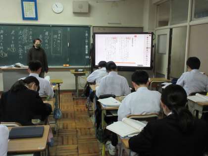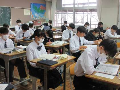 12月12日(火)今日の授業の風景 その2 公開日 2023/12/12 更新日 2023/12/12 お知らせ 1年生の国語科の授業です。 「故事成語を調べる」というテーマのもと学習を進めています。四面楚歌・大器晩成・切磋琢磨・・・など、生徒たちの目標は、便覧や教科書を見て、自分のお気に入りの「故事成語」を見つけることです!生徒たちはどんな「故事成語」を選ぶのかとても楽しみです!