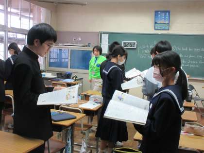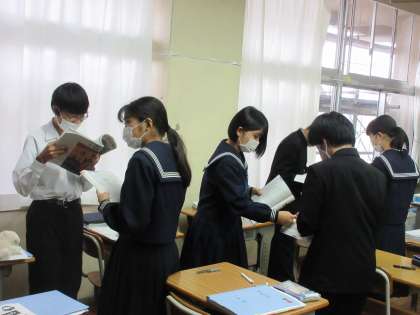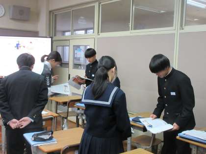 12月12日(火)今日の授業の風景 その4 公開日 2023/12/12 更新日 2023/12/12 お知らせ 2年生の英語科の授業です。 「Read and Think」に取り組んでいました。ちょうど教室を訪ねたときは、「発表を聞き、クラスメートがフィードバックシートにコメントを描いた英文」を読んでいるところでした。近くの友達と英文を読み合う様子を見て、みんなで頑張る姿勢が身に付いているなと感じました。今日も頑張る2年生です!