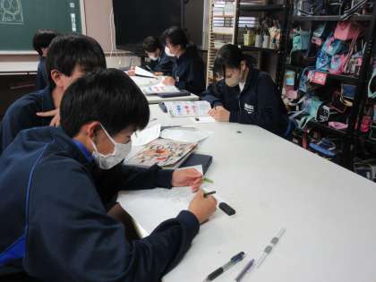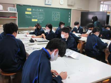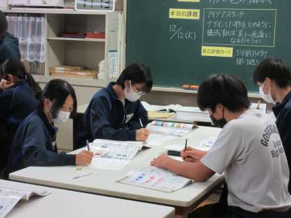 12月12日(火)今日の授業の風景 その6 公開日 2023/12/12 更新日 2023/12/12 お知らせ 2年生の美術科の授業です。 「デザインした形をどのように構成すれば美しい画面になるか」をテーマに作業を進めていました。背景を考えながら、組み合わせを考えながら、アイディアスケッチを進める生徒たち。すてきな作品が一人一人のワークシートに描かれていました。