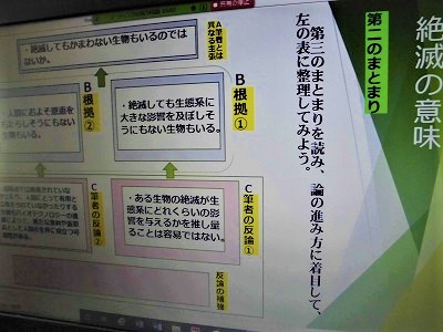 オンライン授業8 公開日 2021/09/17 更新日 2021/09/17 お知らせ 3年生の国語の授業です。説明文「絶滅の意味」について,内容を読み取っています。画面共有で分類された内容を,画面越しに仲間達は吟味しています。頑張れ!