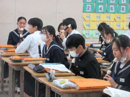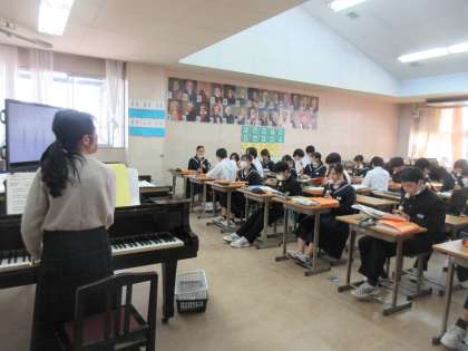 12月13日(水)今日の授業風景 その6 公開日 2023/12/13 更新日 2023/12/13 お知らせ 3年生の音楽科の授業です。 音楽室からは、今日も素敵な歌声やリコーダーの音色が聴こえてきています。ちょうど、音楽室を訪ねたときは、アルトリコーダーの練習の取り組む生徒たちの姿が見られました。繰り返し、担当の先生と一緒に練習に取り組む生徒たち。着実にパワーアップでしています。今日も、様々な活動に全力で取り組む生徒たちです!