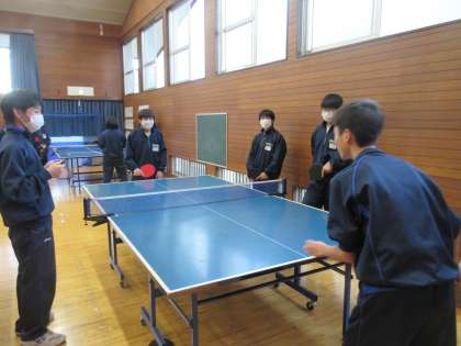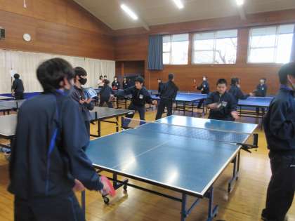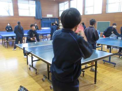 12月13日(水)放課後の様子【男子卓球部】 その2 公開日 2023/12/13 更新日 2023/12/13 お知らせ 武道場でも男子卓球部員は、基本のラリーに熱心に取り組んでいました。先輩・後輩なく卓球を楽しむ姿勢、とてもいいですね!