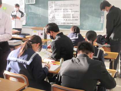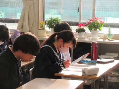 12月14日(木)朝の様子 その4 公開日 2023/12/14 更新日 2023/12/14 お知らせ 3年生学年末テストに向けて、最終確認をする生徒たち。頑張っている姿を見て、ついつい写真を撮ってしましました。今日のテスト、頑張ってほしいです!