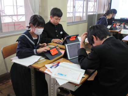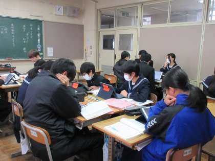 12月15日(金)今日の授業風景 その4 公開日 2023/12/15 更新日 2023/12/15 お知らせ 2年生の国語科の授業です。 杜甫の「春望」の読み取りをしていました。漢詩の読み取るに当たり、タブレットに書き込みをしながら、また、グループで考えを出し合い読み取りを進めていました。考えを互いに交流させながら、学習を進める雰囲気、とてもいいですね!