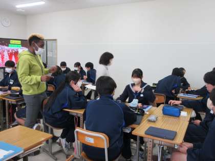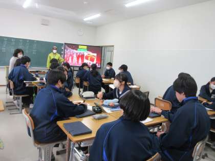 12月15日(金)今日の授業風景 その6 公開日 2023/12/15 更新日 2023/12/15 お知らせ 3年生の英語科の授業です。 クリスマスの時期に合わせた英語でのクイズにチャレンジする生徒たち。ALTが出題するクリスマスにちなんだ問題に、グループで競い合いながら、積極的に取り組む姿が見られました。楽しみながら英語に親しむ生徒たちです!
