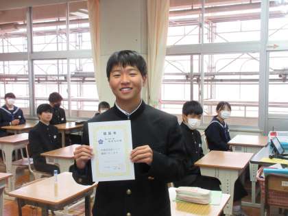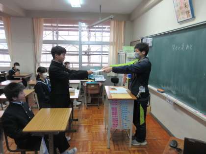 放送による「新生徒会役員認証」が終わった後、担任の先生から、認証書が手渡されました。今日は午後から、御所ケ丘中学校区きらめきフォーラムも予定されていて、最初の仕事になります。本校の推進役として力を発揮していくことでしょう!とてもよい表情の新生徒会役員の生徒たちです!