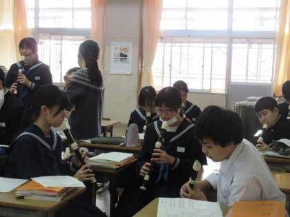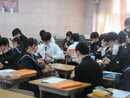 12月20日(水)今日の授業風景 その6 公開日 2023/12/20 更新日 2023/12/20 お知らせ 3年生の音楽科の授業です。 アルトリコーダーの演奏にチャレンジしていました。曲は「空もとべるはず」です。グループで1つの曲を演奏する姿を見て、温かい気持ちになります。だんだん、素敵な演奏になってきています!