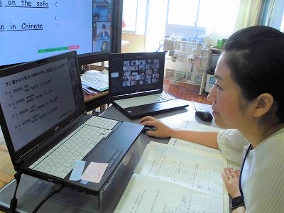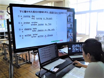 3年生の英語の授業です。画面共有で問題を提示し,わかりやすく説明をしています。マイクのON・OFF機能を活用し,対話的に問題の確認をしています。頑張れ!