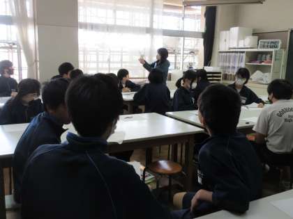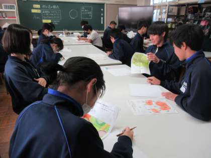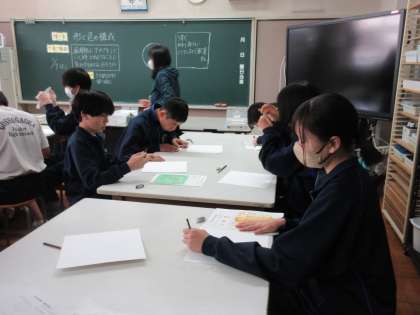 「形と色の構成」をテーマに学習を進めていました。これまで構成してきたアイデアスケッチを画用紙に写し取っていきます。いよいよ本格的な作品づくりに入った生徒たち。前向きに課題に取り組む姿を見て、嬉しく感じました。