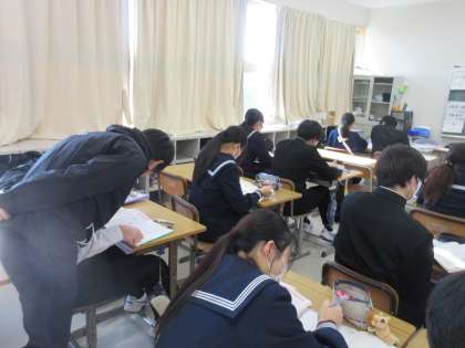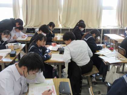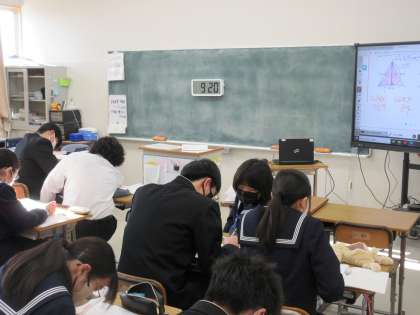 1月10日(水)今日の授業風景 その8 公開日 2024/01/10 更新日 2024/01/10 お知らせ 3年生の数学科の授業です。 まわりの長さが等しい2つの三角形の面積を比べる問題に取り組んでいました。これまでの学習を生かしながら、√を活用したり、定理を使ったり、問題の解決のために一人一人が頑張る姿が見られています。(自然な雰囲気で、友達と考えを交流し合う姿がいいですね!)