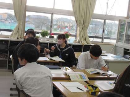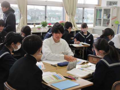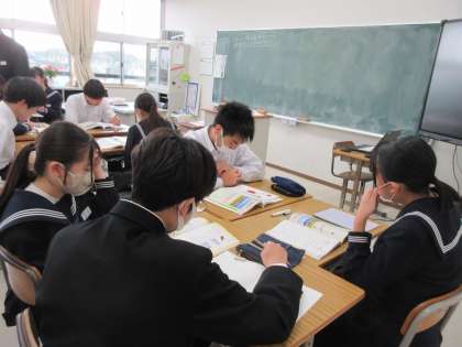 1月11日(木)今日の授業風景 その2 公開日 2024/01/11 更新日 2024/01/11 お知らせ 3年生の数学科の授業です。 「富士山が見える範囲を三平方の定理を使って、どう求めるか」について考えを広げています。数学を生かして、日常の事象を説明できるか、熱心に考える生徒たちです。友達とアイディアを出し合いながら、また、教科書の図にていねいに定規で書き込みながら、解決を目指していました。