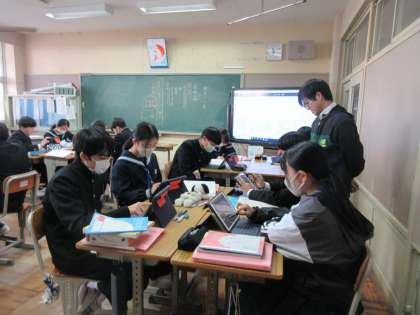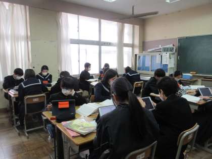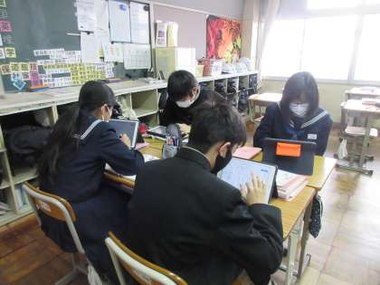 1月11日(木)今日の授業風景 その9 公開日 2024/01/11 更新日 2024/01/11 お知らせ 2年生の国語科の授業です。 「走れメロス」の学習を進めています。今日のテーマは、「メロスと王はどんな人物か」です。タブレットに映し出された全文に書き込みをしながら、グループで考えを広げる様子が見られました。「学力診断のためのテスト」が終わった次の時間ですが、2年生も頑張っています!