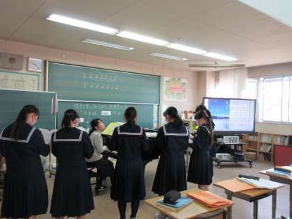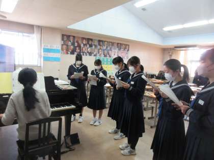 混声三部合唱の曲の合唱練習に取り組んでいました。パートごとに分かれ、練習を進める生徒たち。それぞれのパートごとに頑張って練習に取り組んでいました。素敵な生徒たちの歌声が今日も響く音楽室の様子です!
