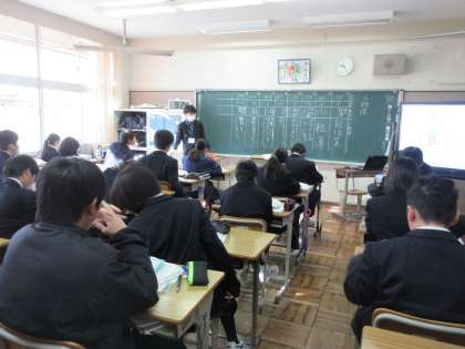 「少年の日の思い出」の学習を進めています。「登場人物二人の人物像」を捉えるというテーマのもと学習を進めていました。教室を訪ねた時は、授業のまとめの場面で何ページの何行目のこの文から人物像を考え、黒板にまとめられていました。(授業のまとめの場面での訪問だったため、写真は1枚になっています。)グループごとに根気強く話し合い、今日の課題に取り組んだ生徒たちです。