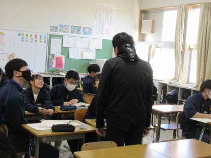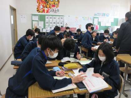 1月15日(月)今日の授業風景 その8 公開日 2024/01/15 更新日 2024/01/15 お知らせ 3年生の数学科の授業です。 日常の事象を数学で解決する問題に取り組んでいました。富士山の山頂が見える範囲を調べていきます。円の性質や定理を活用しながら、グループの友達で問題の解決を目指します。みんなで考えを交流させながら、根気強く考える生徒たちの姿を見て、嬉しく感じました。