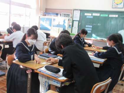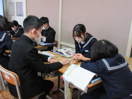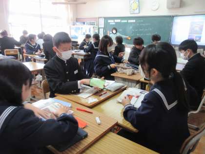 英語のカードを並べ替え、正しい英文づくりにチャレンジしていました。これまでの学習を生かして、カードを並べていく生徒たち。近くの友達と「こうかな?」と考えを交流させながら頑張っていました!