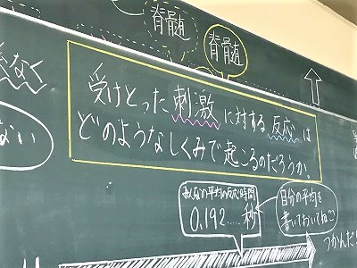 2年生の理科の授業です。今日は人体に関する学びです。神経系の仕組みについて「受け取った刺激に対する反応はどのような仕組みで起こるのだろうか?」ということについて考えたいます。